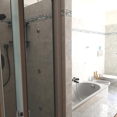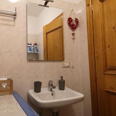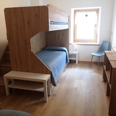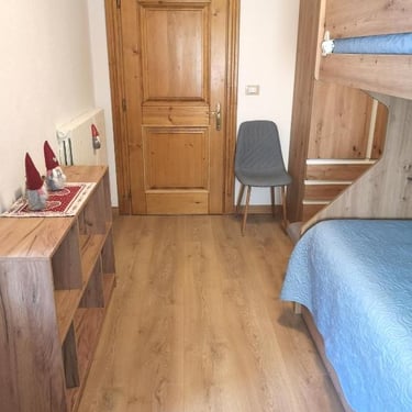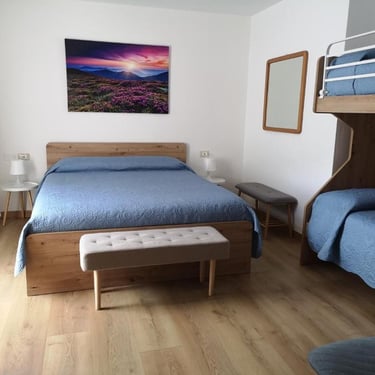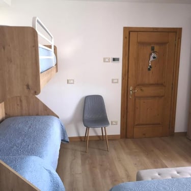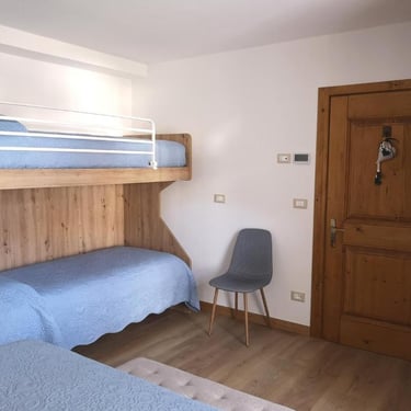 L'appartamento di 90 mq è composto da un'ampia zona living con cucina a vista e soggiorno, una prima camera con letto matrimoniale e letto a castello, una seconda camera con letto a castello più eventuale terzo letto, un primo ampio bagno con box doccia, vasca e bidet, un piccolo secondo bagno con wc, lavabo e lavasciuga e una stanza di servizio.